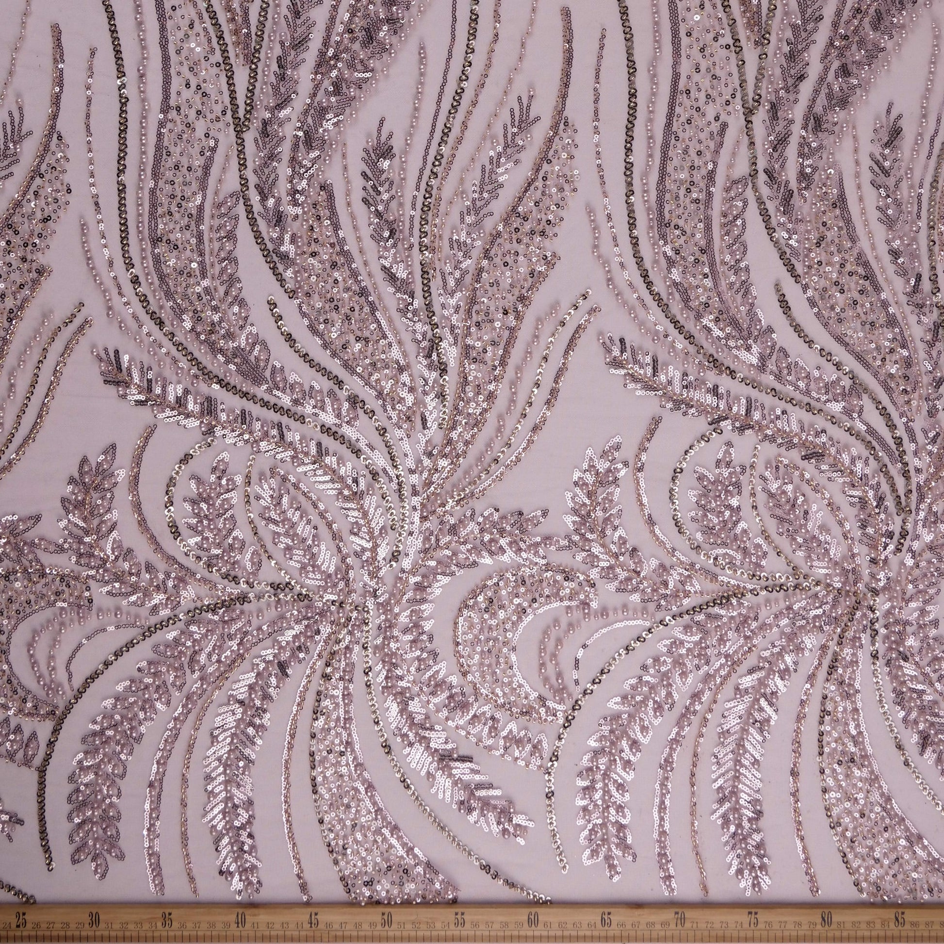 El Tul Gabanna es una tela con bordados y aplicaciones de cristales, canutillos y mostacillas. Es ornamental y lujosa.