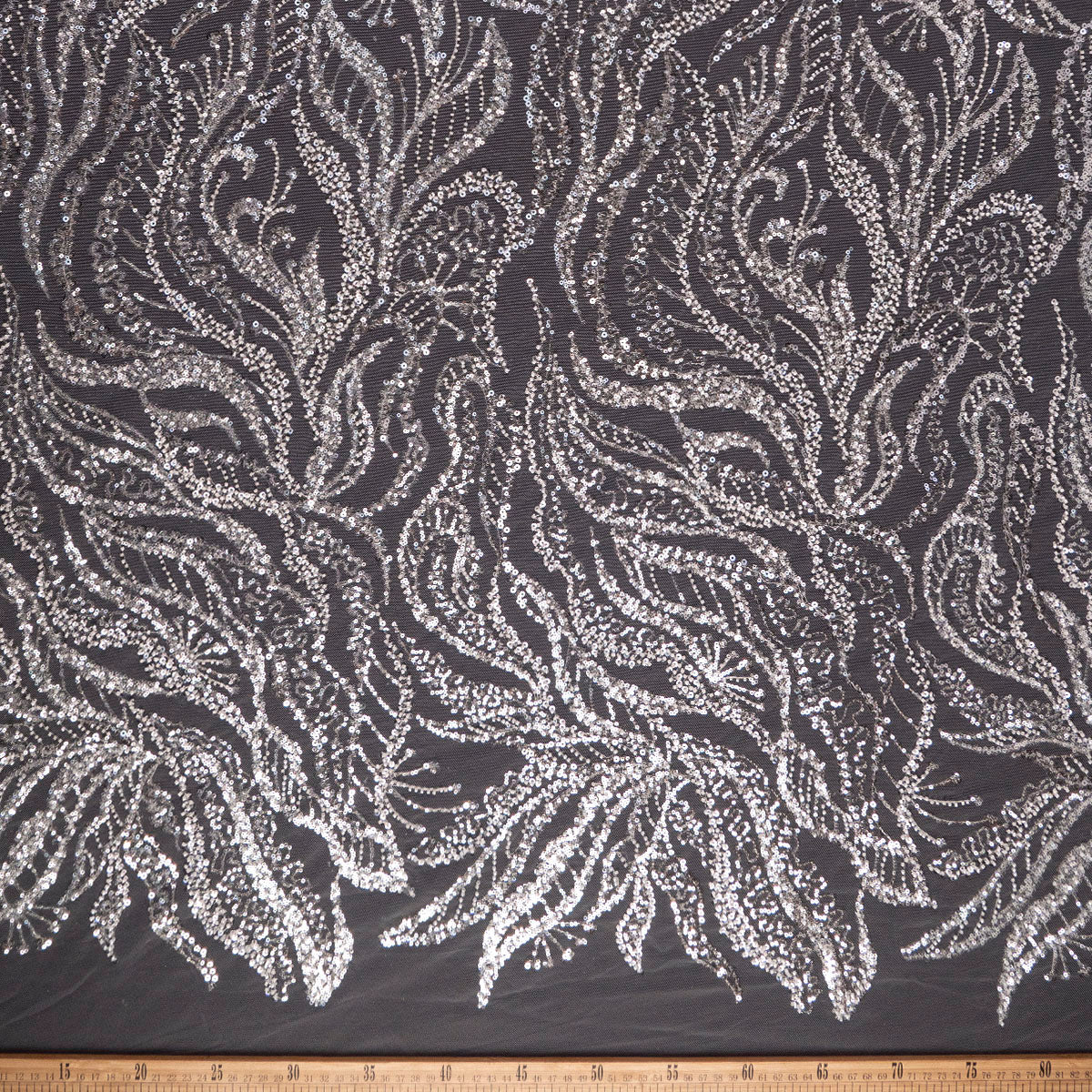 La tela Tul Galliano esta realizada sobre una base de tul en el cual se bordan diferentes tipos de diseños en hilos y cordones. A los cuales de manera ornamental se le aplican piedras, canutillos, mostacillas y paillettes haciendo que cada pieza sea diferente y se pueda usar tanto de día como de noche según la ocasión lo amerite.
