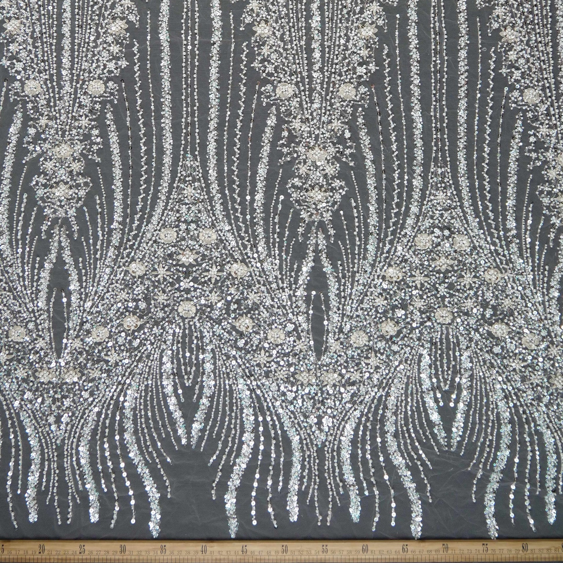 El Tul Prada es una tela de alta sofisticación realizada sobre una base de tul, cuidadosamente bordada con diversos diseños en hilos y cordones. De manera ornamental, incorpora piedras, canutillos, mostacillas y paillettes que aportan brillo, textura y exclusividad, haciendo que cada pieza sea única. Su carácter elegante y versátil permite utilizarla tanto en diseños de día como de noche, ideal para prendas que buscan destacarse con un acabado artesanal y de lujo.